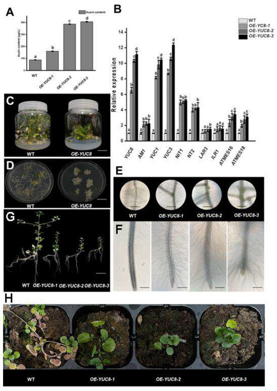 During the regeneration stage, the 35S::NoYUC8 watercress plants showed significant dwarfing (Figure 5D). To better understand the effect of NoYUC8 on root development in watercress, we removed the shoot of the wild-type and 35S::NoYUC8 watercress, and the stem segments were cut and inoculated on an MS medium for 15 days in order to observe the root changes later. We found that the stem segments of the 35S::NoYUC8 watercress produced more roots and lateral roots, shorter root lengths, and more root hairs (Figure 5C,E). We measured the expression levels of the NoYUC8 gene in the OE-NoYUC8-1, OE-NoYUC8-2, and OE-NoYUC8-3 strains and found that the expression level of NoYUC8 in OE-NoYUC8-1 increased by six times, while in OE-NoYUC8-2 and OE-NoYUC8-3, the expression level of NoYUC8 increased by 10–11 times. After measuring the expression levels of auxin synthesis-related genes and the auxin concentration, it was found that in the three OE-NoYUC8 strains, the expression levels of auxin synthesis-related genes were all increased, and the expression levels of the homologous genes of NoYUC8 in the tryptophan synthesis pathway, NoYUC1, and NoYUC3, increased most significantly (Figure 5B). The content of auxin in the OE-NoYUC8-2 and OE-NoYUC8-3 strains was about four times higher, and the content of auxin in the OE-NoYUC8 strain was about two times higher than that in the wild-type (Figure 5A). Later, the three 35S::NoYUC8 watercress strains were placed with the wild-type on a 1.4% agar medium for 7 days, and observation under a microscope showed that with the increase in the NoYUC8 expression level, as the lateral roots increased, the boundary between the root elongation zone and the maturation zone became less distinct, and the root hairs became longer and denser (Figure 5C). This indicates that the overexpression of NoYUC8 enhances the expression of auxin synthesis-related genes, such as YUCs and NITs, which increases the level of auxin in watercress, inhibits its growth, and at the same time, promotes the development of roots and root hairs.