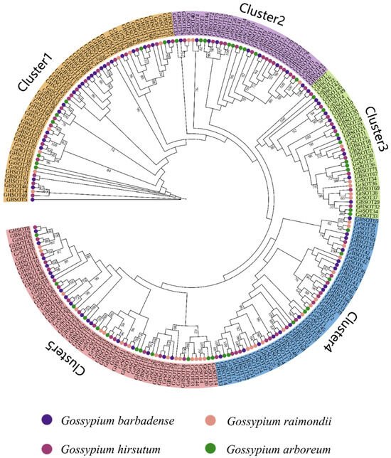 To explore the evolutionary correlation among the SOT genes of four cotton species (G. arboreum, G. hirsutum, G. raimondii, G. barbadense), we used MEGA (MEGA7) and ClustalW to perform the multiple sequence alignment of 241 obtained SOT genes [50]. Based on the comparison results, the evolutionary tree was constructed using the ML (maximum likelihood) method, and the bootstrap value was set to 1000.