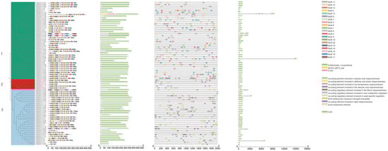 Phylogenetic tree of GBSOT gene, divided into three groups. motif composition and distribution, conserved domain, cis-acting elements of promoter, gene structure (exon–intron organization) from left to right.
