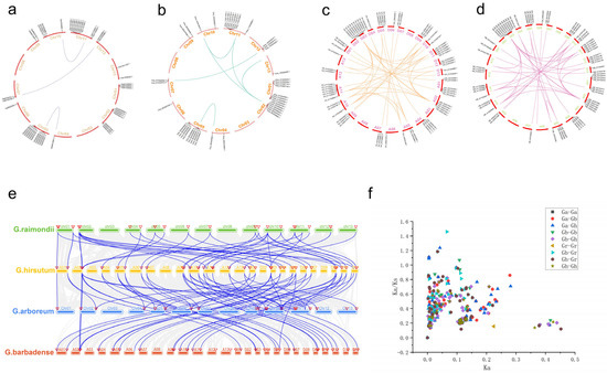 Collinearity analysis of SOT genes. (a) Collinearity analysis of G. arboreum. (b) Collinearity analysis of Gossypium raimondii. (c) Collinearity analysis of Gossypium hirsutum. (d) Collinearity analysis of G. barbadense. (e) Multiple synteny analysis among cotton SOT genes. Multiple synteny analysis was used to show the orthologous relationship among G. arboreum, G. hirsutum, G. raimondii and G. barbadense of SOT genes. The chromosomes of different kinds of cotton are shown in different colors. (f) Selection pressure analysis of the SOT gene family during evolution.