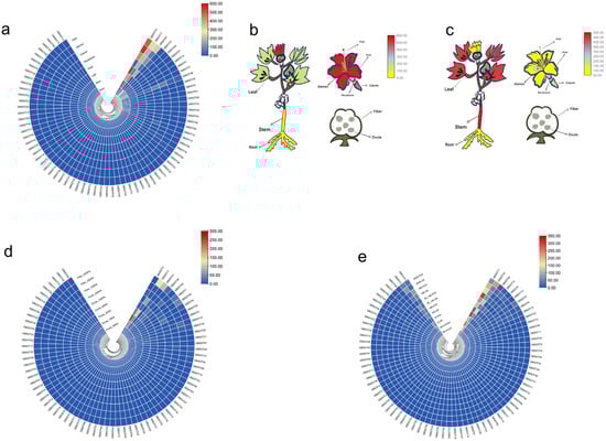 First, G. barbadense varieties Hai7124 RNA-seq data (PRJNA490626) from NCBI (https://www.ncbi.nlm.nih.gov/, accessed on 1 August 2023) were downloaded. Using these data, we examined the GBSOT gene expression in eight distinct tissues (root, stem, leaf, petal, receptacle, calycle, stamen, pistil), as well as during various stages of fiber and ovule development, exploring pheatmaps of expression using TBtools software [48]. Then, we downloaded the RNA-seq data of G. hirsutum TM-1 under cold, heat, salt and PEG stress and analyzed them using TBtools software [48].