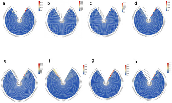 By combining modules with similar expressions using the dynamic shear tree method for weight values, a total of 19 modules were obtained in Xinhai14 and 06-146 materials (Figure 8a). The turquoise module contained the most genes (9687 genes), while the light-yellow module contained the fewest genes. With only 111 genes, each module contains an average of 1871 genes.