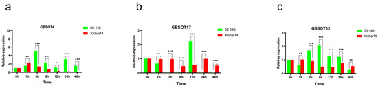 Our previous analysis showed that the expression of a subset of SOT genes changes significantly under FOV stress. Based on transcriptome data analysis and previous QTL mapping results [21,23], we speculated that GBSOT4, GBSOT17 and GBSOT33 may play an important role in the resistance of G. barbadense to FOV. We used qRT-PCR to further study the expression patterns of these three genes under FOV stress in disease-resistant cultivar (06-146) and a susceptible cultivar (Xinhai14), respectively. The results showed (Figure 7) that except at 1 h, the expression level of GBSOT4 in Xinhai14 was higher than that of 06-146, and the expression level of 06-146 in other periods was higher than that of Xinhai14 with significant differences, indicating that this gene may play a positive regulatory role in coping with FOV in G. barbadense. However, GBSOT17 was on the contrary. Although the expression level of GBSOT17 in 06-146 was higher than that of Xinhai14 at 12 h, the expression level of GBSOT17 was lower than that of Xinhai14 at other periods, suggesting that GBSOT17 may play a negative regulatory role in coping with the FOV of G. barbadense. The expression pattern of GBSOT33 and GBSOT4 is similar. The SOT genes described above showed significant changes at different time points after FOV stress, indicating that these genes may be involved in the process of FOV stress in G. barbadense.