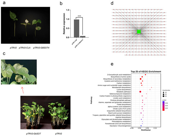 Functional verification of GBSOT4. (a) Phenotypic comparison of silent GBSOT4 plants. (b) VIGS efficiency test of GBSOT4 in G. barbadense. (c) Seedlings of control and silenced plants after inoculation with FOV at 15 days post-inoculation (dpi). (d) The entire network of GBSOT4 constructed based on genome-wide transcriptome data. (e) The KEGG pathway enrichment analysis of the 267 genes. The error bar represents the average ± SEs of three replicates. Compared with the control group, the difference was statistically significant, *** p < 0.001.