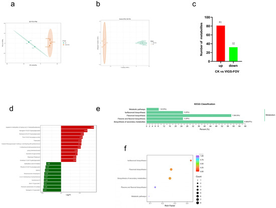 Metabolomic analysis of GBSOT4 gene after inoculation with FOV. (a) Metabolite quantification was performed by principal component analysis (PCA) in two groups of samples. (b) The OPLS-DA analysis in two groups of samples. (c) Shows number of DEMs (up and down). (d) The fold change in the top 20 increased (red columns) or decreased (green columns) flavonoids. The fold change values were log2 transformed. (e) The KEGG classification of the identified DEMs. (f) Enrichment of KEGG pathway. The horizontal coordinate represents the enrichment factors of each biosynthetic pathway. The color of the point represents the p-value (color gradient from blue to red, representing low and high significance, respectively).