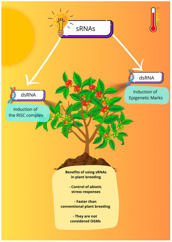 As discussed above, sRNAs are molecules with great potential to be explored in the genetic improvement of coffee plants in the face of climate change. A good strategy for this is the use of RNA interference (RNAi) technology, which has already been extensively studied in plant disease control and plant protection strategies based on the knowledge that double-stranded RNA (dsRNA) molecules derived from plant or exogenous genes can silence essential or virulence genes in microbial pathogens and pests [128,129,130,131]. In this strategy, dsRNA induces the organism’s RISC silencing complex to silence target genes, as illustrated in Figure 1. These strategies are advantageous due to the highly specific, environmentally friendly, and malleable nature of dsRNAs [129].