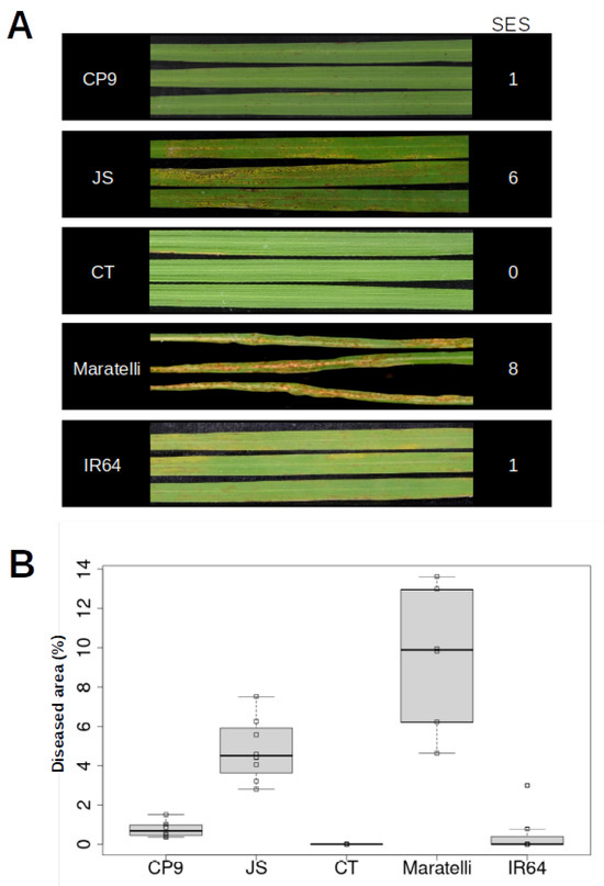 Evaluation of leaf blast resistance of COPSEMAR9 plants under controlled conditions. Rice seedlings at the 3–4 leaf stage were inoculated with M. oryzae spores (5 × 105 spores/mL). Parents used for the generation of COPSEMAR9 were included JSendra (JS, susceptible parent) and CT13432 (CT, resistant parent). Reference cultivars were Maratelli (highly susceptible) and IR64 (resistant). Three independent experiments were carried out with similar results (12 plants each experiment). (A). Representative images of disease symptoms at 7 days post-inoculation with M. oryzae spores. Disease scoring was performed using the 0–9 SES scale (Standard Evaluation System) of IRRI: highly resistant (SES, 0), resistant (SES, 1), moderately resistant (SES, 2–3), moderately susceptible (SES, 4–5), susceptible (SES, 6–7), and highly susceptible (SES, 8–9). SES values are indicated on the right side. (B). Percentage of the leaf area affected by blast lesions as determined by image analysis. Values obtained for each biological replicate were plotted. The horizontal line within the box represents the median value. Outliers are included.