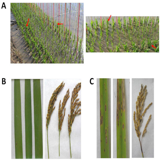 Evaluation of leaf and panicle blast resistance of COPSEMAR9 plants under natural infection conditions. (A). Experimental design used in this study for field trials. Plants were transplanted in rows of 5 plants with a 10 × 10 cm spacing. The plot was surrounded by Baixet plants (highly susceptible to blast (red arrows). A row of Baixet plants was also included every two rows (red labels). (B,C), Representative images of leaves and panicles of COPSEMA9 (B) and Baixet (C) plants at 20–25 days after heading. Additional images of blast symptoms in panicles of COPSEMAR9 and Baixet plants are shown in Figure S1.