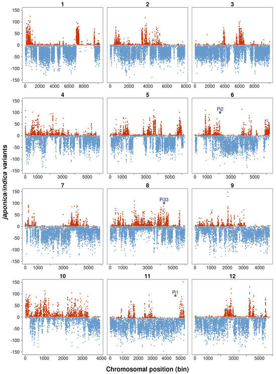 Identification of indica DNA regions introgressed into the genome of COPSEMAR9. Scatter plots showing the classification of genomic sequences (bins) as indica, japonica or not assigned sequences (red, blue and grey dots). Details on the procedure used for classification of genomic sequences as indica or japonica sequences, and data processing can be found in Materials and Methods. For each chromosome, the x-axis shows the bin/window number. The y-axis shows the difference of the counts of variants between japonica and indica (e.g., subtracting japonica from indica reads). The chromosomal location of Pi1, Pi2 and Pi33 is indicated (Chromosome 11, 6 and 8, respectively).