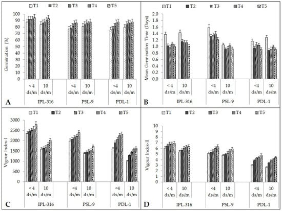 Effect of seed priming on different seed quality parameters: (A) germination (%); (B) mean germination time (days); (C) vigor index-I and (D) vigor index-II. Error bars depict significant differences (p < 0.05), where cases of means are three (n = 3). T1 = control; T2 = hydropriming (18 h); T3 = silicic acid (@3 mM 18 h); T4 = humic acid (@600 ppm 18 h); T5 = combination of humic acid and silicic acid (@100 ppm + 1 mM 16 h).