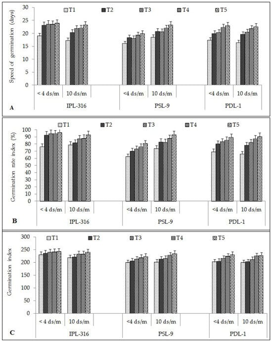 Similar trends were observed under the salinity stress conditions where the combination treatment showed better results among all three varieties. In IPL-316, the speed of germination was found to be increased significantly by 18% after hydropriming, 27% using silicic acid which was on par with the humic acid treatment and showed a 28% increase, while it increased significantly by 35% using a combination of humic acid and silicic acid under the 100 mM salinity stress condition as compared to the control. For PSL-9 under the salinity stress condition, the speed of germination was found to be increased significantly by 11%, 11%, 16%, and 11% after hydropriming, silicic acid, humic acid, and using a combination of humic acid and silicic acid, respectively. Similarly, in PDL-01, the speed of germination was increased BY up to 16% after hydropriming, 20% with silicic acid, 25% using humic acid, and 27% using a combination of humic acid and silicic acid.