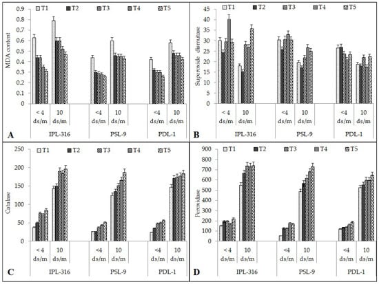 Effect of seed priming on different seed quality parameters: (A) malondialdehyde (MDA); (B) superoxide dismutase (SOD); (C) catalase (CAT); (D) peroxidase (POX). Error bars depict significant differences (p < 0.05), where cases of means are three (n = 3). T1 = control; T2 = hydropriming (18 h); T3 = silicic acid (@3 mM18 h); T4 = humic acid (@600 ppm 18 h); T5 = combination of humic acid and silicic acid (@100 ppm + 1 mM 16 h).