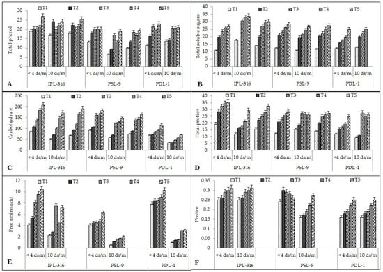 Effect of seed priming on different seed quality parameters: (A) total phenol; (B) total soluble content; (C) carbohydrate; (D) total protein; (E) free amino acid; (F) proline. Error bars depict significant differences (p < 0.05), where cases of means are three (n = 3). T1 = control; T2 = hydropriming (18 h); T3 = silicic acid (@3 mM 18 h); T4 = humic acid (@600 ppm 18 h); T5 = combination of humic acid and silicic acid (@100 ppm + 1 mM 16 h).