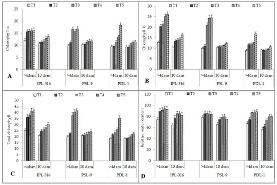 Effect of seed priming on different seed physiochemical parameters: (A) chlorophyll-a; (B) chlorophyll-b; (C) total chlorophyll content; (D) relative water content. Error bars depict significant differences (p< 0.05), where cases of means are three (n = 3). T1 = control; T2 = hydropriming (18 h); T3 = silicic acid (@3 mM 18 h); T4 = humic acid (@600 ppm 18 h); T5 = combination of humic acid and silicic acid (@100 ppm + 1 mM 16 h).