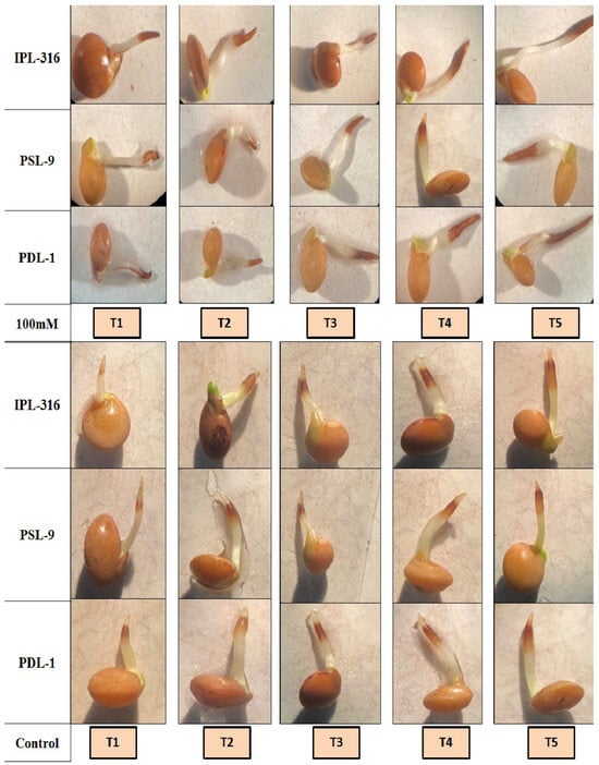 Under the 100 mM salinity stress condition, the germination index in IPL-316 was found to be increased significantly by 2% after hydropriming, 7% with silicic acid, 7% using humic acid, and 10% using a combination of humic acid and silicic acid as compared to the control. In PSL-9, the germination index was found to be increased significantly by 5%, 6%, 12%, and 9% after hydropriming followed by silicic acid, humic acid, and a combination of humic acid and silicic acid, respectively, under the salinity stress condition. For PDL-01, a similar trend was found, and the results showed germination index was increased by 1% after hydropriming, 6% by silicic acid, 11% using humic acid, and 12% using a combination of humic acid and silicic acid.
