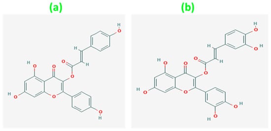 Phytochemical investigations on parts of C. asiatica indicated the presence of isoprenoids (sesquiterpenes, plant sterols, pentacyclic triterpenoids, and saponins) and phenylpropanoid derivatives (eugenol derivatives, caffeoylquinic acids, and flavonoids) []. Of these identified compounds, flavonoids and their derivatives tend to meet a large number of pharmacological requirements. Kaempferol, a highly occurring phenolic compound in the medicinal plants, is also found in this plant in its whole form and as a coumarate derivative. The coumarate derivatives of kaempferol such as castilliferol (3-(4-Hydroxy-trans-cinnamoyloxy)-4’,5,7-trihydroxyflavone) and castillicetin ([2-(3,4-dihydroxyphenyl)-5,7-dihydroxy-4-oxochromen-3-yl]E)-3-(3,4-dihydroxyphenyl)prop-2 enoate) [] are the least explored compounds in terms of structural activity identification. Structurally, both compounds possess a basic flavonoid skeleton in addition to a cinnamoyloxy unit present in position 4 of the C ring. Both castilliferol and castillicetin differ in the number of hydroxyl units, i.e., for castilliferol four hydroxyl(-OH) units are present in C4’, C5, C7, and C8(cin), whereas for castillicetin six hydroxyl units are present in the C3’, C4’ C5, C7,, C7(cin), and C8(cin) positions.