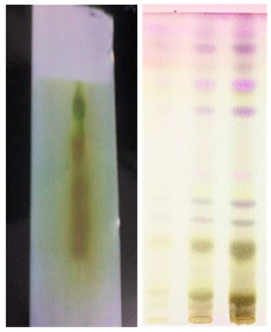 The extract in the mixed extraction solvent was identified via thin-layer chromatography. Identification using TLC was based on glycoside content in C. asiatica. The plate used in the process was silica gel GF254 developed with chloroform-MeOH (8:2). The spot was visualized by spraying H2SO4 (10%) on the plate.