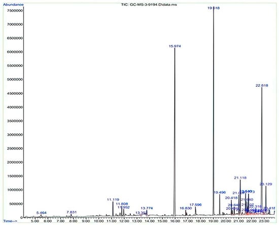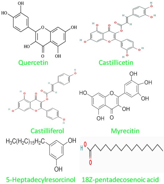 In the GC-MS analysis of the MeOH extract of C. asiatica, 32 chemical constituents (Figure 4) were identified by comparing their chromatograms and mass spectral data with those of reference standard compounds from the NIST-09 library. The classes of compounds identified in this plant (Figure 5) included triterpene glycosides (1), xanthones (1), alkylresorcinols (1), anthocyanins (3), aromatic amide (1), alkaloids (2), polyaromatics (1), flavonoid glycosides (4), phenolic acids (2), coumarin (1), lignans (1), phytosterols (1), prenol lipids (1), saturated fatty acid (1), stilbenes (1), and 10 other compounds that were not identified. Some of the most abundant compounds in this work were quercetin (RT 23.35), castilliferol (RT 23.12), castillicetin (RT 22.8), and myricetin (RT 7.83); an unidentified compound (RT 6.44), 5-Heptadecylresorcinol (RT 5.46), and 18Z-pentadecosenoic acid (RT 13.77) were also present in the GC-MS spectra [].