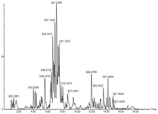 In the LC-MS analysis of C. asiatica, a total of 22 compounds were detected and identified (as shown in Table 5 and Figure 6). The identification of these compounds was based on accurate measurements of their mass and the fragmentation patterns observed [], which allowed for their structural characterization. These compounds (Table 5) belonged to various chemical classes, including alkaloids (two compounds), anthocyanins (three compounds), flavonoid glycosides (four compounds), coumarin (one compound), polyaromatics (one compound), lignans (one compound), phenolic acids (two compounds), phytosterols (one compound), stilbenes (one compound), triterpene glycosides (one compound), and xanthones (one compound). Additionally, there were five other compounds that were detected but could not be specifically identified. It is worth noting that some of these compound classes have been previously reported in other research studies. Overall, this analysis provided a comprehensive overview of the chemical constituents present in C. asiatica, shedding light on its complex composition and potential bioactive compounds.
