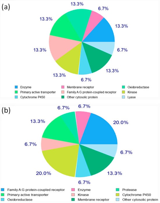 The screening of appropriate targets is a key phase in the drug discovery process. Because the investigated chemicals castilliferol and castillicetin are effective antioxidants, identifying the targets of their interest is critical here. As a result, target prediction analysis was performed using the SwissAdme online database(Figure 9) [], which selected multiple targets for both drugs, with the top nine targets chosen for interpretation. It has been discovered that enzymatic and protein-linked receptors, oxydoreductase receptors, kinase receptors, and cytosolic receptors are suited for castilliferol. In addition to protein-linked receptors, cytochrome P450 is a target of interest for castillicetin. Castillicetin appears to have a higher percentage of target screening than castilliferol.