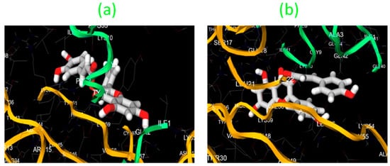 Frontier molecular orbitals are important in a variety of chemical processes because they explain the charge distribution of flavonoids. Electron delocalization in a compound characterizes a molecule’s capacity to donate electrons. In a conceptual sense, the highest occupied molecular orbital (HOMO) is the highest energy orbital that is still occupied, and since it is occupied, it is simpler to remove electrons from this orbital []. For castilliferol and castillicetin (Figure 8), the highest occupied orbitals seem to be concentrated in the B ring and A ring, suggesting that these two rings are the active participants in radical scavenging activity, whereas unoccupied orbitals are found to be overlapped over the A ring, since the carbon atoms in the ring are found to attach with oxygen atoms, which exhibit the highest electronegativity. The energy gaps between the occupied energy levels and unoccupied energy levels of castilliferol and castillicetin were found to be 4.06 eV and 3.95 eV.