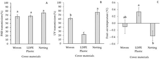 Influence of woven cover, LDPE plastic cover, and netting on PAR (A), UV radiation transmission (B), and fruit air temperature differences (C). Columns with different letters are statistically significant by the Tukey’s test.