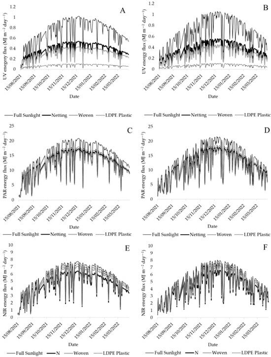 Variation in solar radiation flux in the range of UV (360–390 nm) (A,B); PAR (400–700 nm) (C,D); and NIR (700–1120 nm) (E,F) under netting, woven covers, and LDPE plastic covers in Linares and Traiguén.