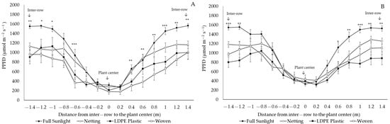 Transmission of photosynthetic photon flux density (PPFD) in ‘Legacy’ (A) and ‘Top Shelf’ (B) cultivars under netting and woven and LDPE plastic covers. Linares, Maule Region, Chile. *;**;*** significance at p < 0.05, 0.01 and 0.001, respectively.