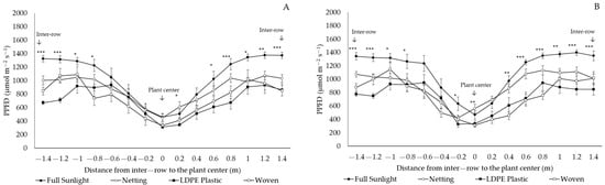 All the covers decreased the photosynthetic photon flux density (PPFD) transmitted to the plant for ‘Legacy’ and ‘Top Shelf’ in both locations, with greater magnitude and significance from 80 cm to 140 cm from the center of the plant to the middle of the inter-row (Figure 3 and Figure 4). In Linares, the proportion of transmitted PPFD was reduced by 46.7%, 37.9%, and 22.6% in ‘Legacy’ under woven covers, LDPE plastic covers, and netting, respectively (Figure 3A). In ‘Top Shelf’, the transmitted PPFD decreased by an average of 43.6%, 32.1%, and 21.1% under LDPE plastic covers, woven covers, and netting, respectively (Figure 3B). In Traiguén, PPFD transmission decreased by an average of 36.8%, 31.7%, and 22% in ‘Legacy’ (Figure 4A), while for ‘Top Shelf’, reductions of 36.4%, 32.2%, and 20.5% were recorded under the same protection covers, respectively (Figure 4B).