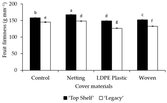 Influence of the interaction of cover materials (netting, woven, and LDPE plastic) with ‘Legacy’ and ‘Top Shelf’ cultivars on fruit firmness of blueberries in Traiguén. Columns with different letters are statistically significant by the Tukey’s test.