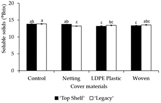 Influence of the interaction of cover materials (netting, woven, and LDPE plastic) with the ‘Legacy’ and ‘Top Shelf’ cultivars on the content of soluble solids of blueberries in Traiguén. Columns with different letters are statistically significant by the Tukey’s test.