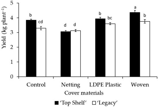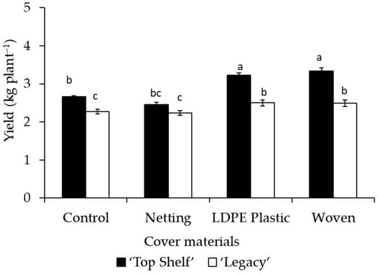 Influence of the interaction of crop cover material (netting, woven cover, and LDPE plastic cover) with ‘Legacy’ and ‘Top Shelf’ cultivars on yield in Linares. Columns with different letters are statistically significant by the Tukey’s test.