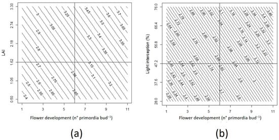 Graphic representation of the fit model for the multiple linear regression analysis between yield, flower development, and leaf area index (LAI) (regression model: Y = 2.16 + 0.09 × Fert + 0.2 × LAI; R2 = 0.63*; p < 0.05) (a) and between yield, flower development, and light interception (regression model: Y = 1.87 + 0.08* Fert + 0.01*Interception; R2 = 0.64*; p < 0.05) (b) as affected by covers and cultivars. Numbers on contour graph lines represent yield values in kg plant−1.