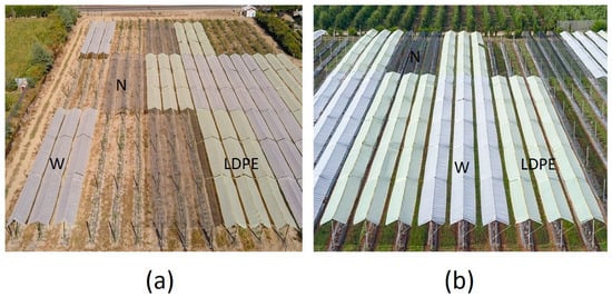 Once harvest was finished, the photosynthetic photon flux density (PPFD, µmol m−2 s−1) was measured using an AccuPAR LP-80 ceptometer (Decagon Devices, Pullman, WA, USA) according to the methodology proposed by Wünsche et al. [55]. For this, two hours before solar noon (11:00), at solar noon (13:00), and two hours after solar noon (15:00), the ceptometer rod was passed at ground level and under the canopy of the plant and from the midpoint of the inter-row to the other midpoint of the following row and every 20 cm, leaving the unitary sensor of the ceptometer in full sun as a reference. Based on the information obtained, the amounts of PPFD transmitted (%) by the plant, light interception (%), and leaf area index (LAI) were determined under the different covers.