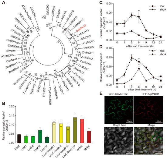 Expression pattern of OsMDH12. (A) Phylogenetic relationship of MDH proteins in rice, Arabidopsis, and tomato. Bootstrap values from 1000 trials are indicated. (B) Expression levels of OsMDH12 in different rice organs. Samples were taken from Zhonghua11 grown in a paddy field. (C,D) Time-course expression of OsMDH12 under salt (C) and cold (D) treatment. Standard deviations are based on three biological replicates. (E) Subcellular localization of OsMDH12 protein in leaves of N. benthamiana. 35S:GFP-OsMDH12 and 35S:RFP:AtpMDH1 were co-transformed into the leaves of Nicotiana benthamiana. AtpMDH1 serves as a peroxisome marker. The scale is set at 50 μm.