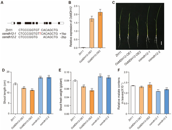 Appearance and malate contents of OsMDH12 transgenic lines at the seedling stage. (A) The osmdh12 knockout mutants were generated using CRISPR gene editing technology. (B) Expression level of OsMDH12 in two independent overexpressing lines. (C) Phenotype comparison of ZH11, OsMDH12-OE lines, and osmdh12 mutants (two different CRISPR lines) at the seedling stage. The scale is set at 2 cm. (D,E) Plant height (D) and fresh weight (E) in ZH11, OsMDH12-OE, and osmdh12 mutants. (F) Malate content in ZH11, OsMDH12-OE, and osmdh12 mutants. Values are presented as mean ± SD (n = 10); ** p < 0.01 (t-test).