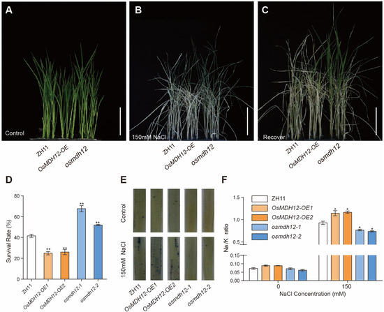 Performance of OsMDH12 transgenic plants under salt stress. (A–C) Two-week-old rice seedlings from ZH11, OsMDH12-OE, and osmdh12 plants (A) were treated with 150 mM NaCl for seven days (B) and then allowed to recover for three days (C). The scale is set at 5 cm. (D) Survival rate under salt stress. (E) Phenotype revealed by NBT staining after 24 h of salt stress. (F) Na+/K+ ratio in ZH11, OsMDH12-OE, and osmdh12 mutants. Values represent the mean ± SD (n = 3); * p < 0.05, ** p < 0.01 (t-test).