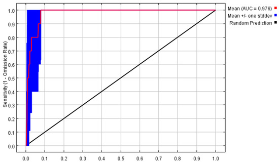 Receiver operator characteristic curve tests the accuracy of MaxEnt model.