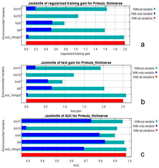 Jackknife test of importance of environmental variables. (a) Regularized training gain; (b) test gain; (c) AUC value.