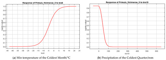 Results from MaxEnt showed that Min Temperature of the Coldest Month (bio6), Precipitation Seasonality (coefficient of variation) (bio15), Precipitation of the Coldest Quarter (bio19), silt, and soil_1kmgrd were the dominant factors affecting the suitable distribution for P. filchnerae. In terms of the percentage contribution of the variables, the total contribution of Min Temperature of the Coldest Month (bio6) and Precipitation of the Coldest Quarter (bio19) was more than 65%, while if we take the Jackknife test into consideration, Min Temperature of the Coldest Month (bio6) and silt were the most dominant factors affecting the distribution of P. filchnerae. In general, Min Temperature of the Coldest Month (bio6) (>−5 °C), Precipitation of the Coldest Quarter (bio19) (<40 mm), and silt were highly significant for the distribution of P. filchnerae. It is clear that climate factors are crucial determinants of species distributions at different scales [30]. Min Temperature of the Coldest Month (bio6) determines whether P. filchnerae could survive and this was consistent with previous similar research [31]. Researchers also found the precipitation of warmest and coldest quarters (bio18 and bio19) to be the highest weight cofactors for projecting the future potential distribution of high-value medical plants in Nepal [32]. Primula filchnerae has a flowering period from February to April, and its growth is closely related to temperature, especially the Min Temperature of the Coldest Month that determines whether P. filchnerae can survive the coldest weather in the winter. Moreover, our results also indicated that precipitation was also an important factor that restricted P. filchnerae’s suitable habitats. Water was reported to play an indispensable role in root growth, release of seed dormancy [33,34,35], and promotion of germination, which is consistent with our observations that seeds of P. filchnerae, when held in Petri dishes and covered with water, would germinate within several days.