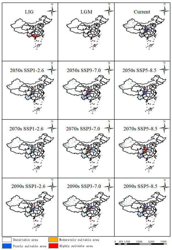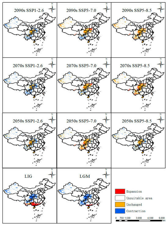 The predicted distribution patterns in various periods were compared with the current distribution (Figure 5), and its distribution in different periods under various scenarios witnessed different trends. From last interglacial period to the current, Guangxi and Guangdong experienced the largest increases in suitable habitat compared with changes in other periods. From the last glacial maximum to the present, it can be seen that Guangxi and Guangdong also experienced increases in suitable areas in their southern areas. From the 2050s, 2070s, and 2090s under three scenarios, they displayed almost the same distribution patterns. Under the SSP1-2.6 scenario, the most stable areas were Shaanxi Province and Sichuan Province, with the largest contraction areas in the Xinjiang Uygur Autonomous Region, Yunnan Province, Guizhou Province, Henan Province, and Hubei Province. Under the scenario SSP3-7.0 in the 2050s, the suitable distribution pattern displayed the most stable distribution compared with the 2070s and 2090s, and the major contraction areas were in Yunnan Province and Guizhou Province. Meanwhile, under the scenario SSP5-8.5, the distribution pattern showed a similar pattern in the 2090s and 2070s with a minor contraction in Xinjiang. Nevertheless, the 2050s covered more contraction areas in Xinjiang, Yunnan, Guizhou, Henan, and Hubei Provinces.