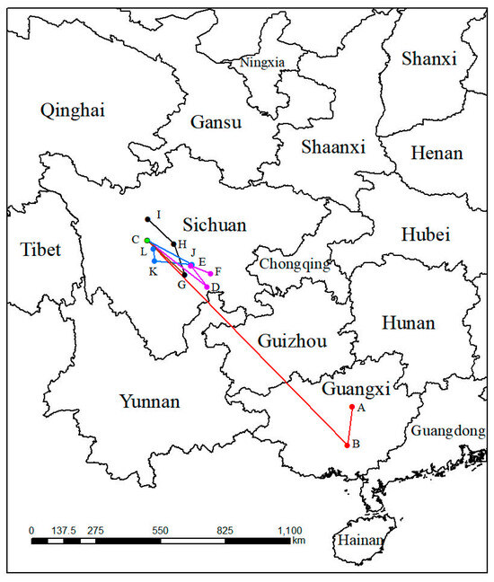 Migration of the center of suitable habitat for P. filchnerae since the last interglacial period. The letters refer to (A) LIG, (B) LGM, (C) Current, (D) 2050s-SSP1-2.6, (E) 2070s-SSP1-2.6, (F) 2090s-SSP1-2.6, (G) 2050s-SSP3-7.0, (H) 2070s-SSP3-7.0, (I) 2090s-SSP3-7.0, (J) 2050s-SSP5-8.5, (K) 2070s-SSP5-8.5, and (L) 2090s-SSP5-8.5.