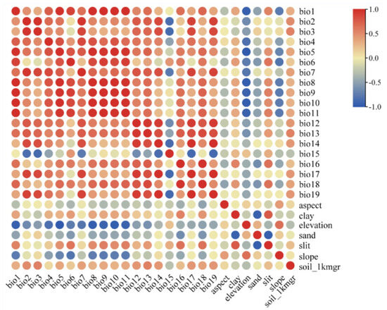 A total of 26 environmental factors (Table 1) with 2.5 arc-minute (~5 km2) resolution were initially used to construct the MaxEnt model, among which 19 bioclimatic variables and 3 topographical variables were downloaded from the model of BCC-CSM2-MR in the World Climate Database (WorldClaim, http://worldclim.org/ (accessed on 1 September 2023)) released by the Coupled Model Intercomparison Project Phase (CMIP6), including the last interglacial period, the last glacial maximum period, and four additional periods: Current (1970–2000), the future 2050s (2040–2060), the future 2070s (2060–2080), and the future 2090s (2080–2100), which include the four shared socioeconomic paths SSP1-2.6, SSP2-4.5 (exception), SSP3-7.0, and SSP5-8.5. They are employed to describe various socioeconomic paths in order to predict and understand the impact of climate change under different socio-economic conditions. They were used to construct MaxEnt model to predict P. filchnerae distribution in different periods and calculate its expansion and reduction under different climate change scenarios. Four environmental variables, clay, sand, silt, and soil_1kmgrd (representing various soil types), were obtained from the Institute of Geographic Sciences and Natural Resources Research, Chinese Academy of Sciences (http://www.resdc.cn (accessed on 1 September 2023)). In consideration of correlations between environmental variables, the contribution of environmental factors from MaxEnt and Spearman correlation analysis (Figure 8) were combined to select environmental variables. Then, pairs of variables that were correlated above |0.8| were singled out with the variable showing the lower contribution omitted. Finally, five variables (bold variables in Table 3) were used to establish the model. Environmental factors were set as continuous variables and the jackknife method employed to evaluate the importance of environmental variables. Response curves were generated to predict suitable conditions for species, with the test data set to 25%, and the model was run 1000 times and repeated 10 times. Other parameters were set to system default values.