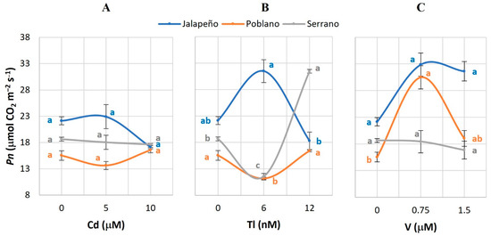 Net photosynthetic rate (Pn) in three chili pepper varieties (Jalapeño, Poblano, and Serrano), treated with different doses of cadmium (A), thallium (B) or vanadium (C), for 60 d in a hydroponic system. Means ± SEM. Different letters in each subfigure and variety indicate significant statistical differences among treatments (Tukey, p ≤ 0.05). n = 4.