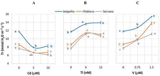 Transpiration rate (Tr) in three chili pepper varieties (Jalapeño, Poblano, and Serrano), treated with different doses of cadmium (A), thallium (B) or vanadium (C), for 60 d in a hydroponic system. Means ± SEM. Different letters in each subfigure and variety indicate significant statistical differences among treatments (Tukey, p ≤ 0.05). n = 4.