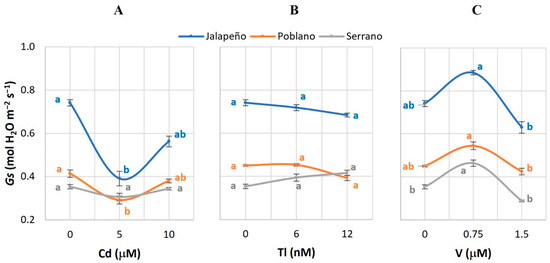 The medium dose of Cd (5 µM) reduced Gs by 47.2 and 29.5% in Jalapeño and Poblano, compared to the controls (Figure 3A). The evaluated doses of Tl did not affect this variable (Figure 3B), while the application of 0.75 µM V increased Gs by 31% in Serrano. Although this same trend was observed in Jalapeño and Poblano, V did not have statistically significant effects on this variable (Figure 3C).
