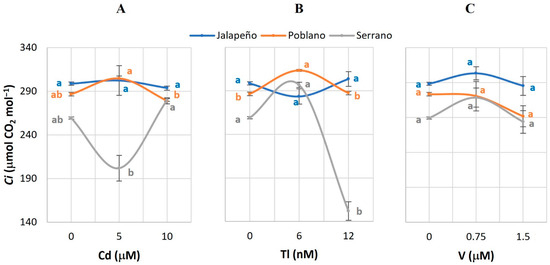 Intercellular CO2 concentration (Ci) in three chili pepper varieties (Jalapeño, Poblano, and Serrano), treated with different doses of cadmium (A), thallium (B) or vanadium (C), for 60 d in a hydroponic system. Means ± SEM. Different letters in each subfigure and variety indicate significant statistical differences among treatments (Tukey, p ≤ 0.05). n = 4.