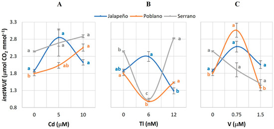 Instant water use efficiency (instWUE) in three chili pepper varieties (Jalapeño, Poblano, and Serrano), treated with different doses of cadmium (A), thallium (B) or vanadium (C), for 60 d in a hydroponic system. Means ± SEM. Different letters in each subfigure and variety indicate significant statistical differences among treatments (Tukey, p ≤ 0.05). n = 4.