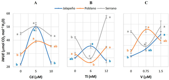 The application of Cd, Tl, and V increased the values of the iWUE variable in the Jalapeño, Poblano, and Serrano varieties (Figure 6). In sugarcane cv. TCP02-4587 plants subjected to water stress for 30 d, significant increases in iWUE were recorded [59]. The iWUE is the relationship between net CO2 assimilation, stomatal conductance, and water value, and is used to compare photosynthetic properties [60]. The relationship between the reduction of Gs and the increase in Pn causes the carboxylation capacity to increase as a response to the homeostasis imbalance [59]. Therefore, increases in iWUE facilitate carbon absorption under abiotic stress, which implies that increases in iWUE stimulate survival and productivity indicators in plants exposed to different types of environmental stress.
