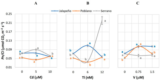 Instantaneous carboxylation efficiency (Pn/Ci) in three chili pepper varieties (Jalapeño, Poblano, and Serrano), treated with different doses of cadmium (A), thallium (B) or vanadium (C), for 60 d in a hydroponic system. Means ± SEM. Different letters in each subfigure and variety indicate significant statistical differences among treatments (Tukey, p ≤ 0.05). n = 4.